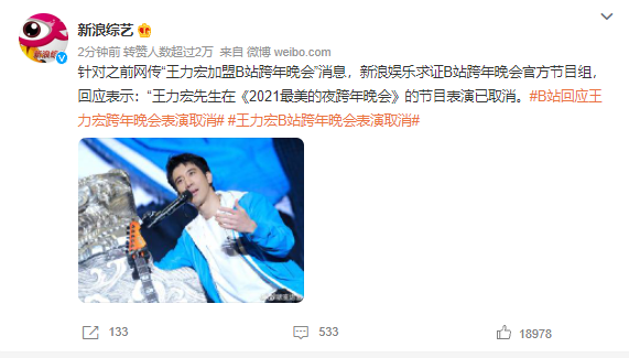 针对之前网传“王力宏加盟B站跨年晚会”消息,新浪娱乐求证B站跨年晚会官方节目组,回应表示:“王力宏先生在《2021最美的夜跨年晚会》的节目表演已取消。