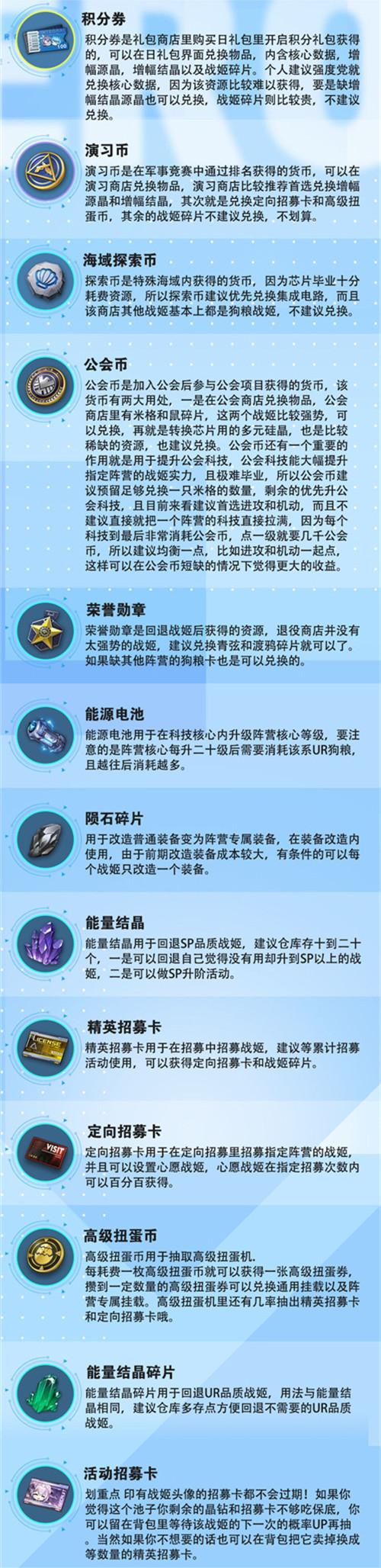 还可以用于在补给商店和废墟基地的军事考核里购买资源,补给商店建议购买蓝卡碎片;军事考核里神秘商人小胡桃建议买集成电路,如果要是缺战姬升级用的作战影像的话也可以买。