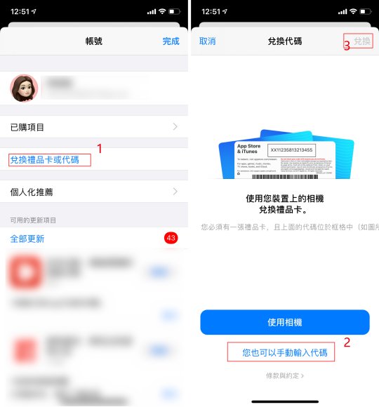 5、在App Store内依次点击下图标记的位置,输入礼品卡的密码即可充值成功。