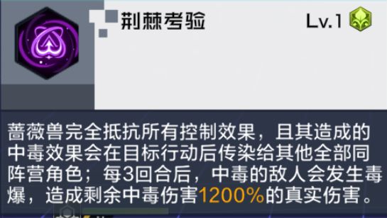 除了中毒以外,BOSS附带“荆棘考验”BUFF,除了免疫所有控制效果以外,造成中毒效果会在目标行动后传染给其他全部同阵营角色。每3回合会对中毒的敌人造成真实伤害。无法及时解除中毒,中毒蔓延、真实伤害毒爆是导致战败的主要原因。