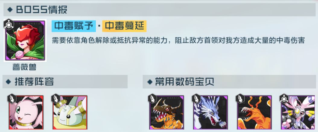 荆棘考验的BOSS每回合都会对我方数码兽附加“中毒”状态,中毒会每回合带来持续性伤害。