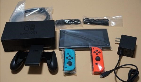 全套Switch组成,可以分为箱子、底座、平板、Joy-Con、Joy-Con手柄、手柄绳、HDMI线、充电线8个部分,有时也会有卖家附赠的其他配件或者一并出售的卡带或者数字版游戏。
