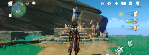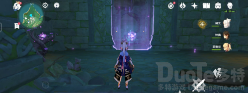 第四个【荒海】这里找那个雷元素柱子全部点亮,然后会给一个宝箱,然后跳就那个残缺圆洞里里面有一个紫色石狐用留念镜识别然后按墙是的突出石板