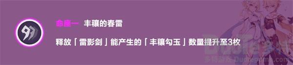 一命:核心命座,而且很快就能通过供奉神树获得。多一枚勾玉意味着雷主提供的元素能量提高了50%,并且三个勾玉可以让三个队友捡,那就覆盖到全队了,但实际上不会一个个切出来捡,一般只给一个最关键的角色,比如缺充能的主C。