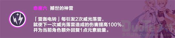 四命:关键命座。让角色更快地从零开始充能。并且这个命座提升后的充能强度可以达到缓解追忆4副作用的效果。追忆套的使用有两大条件:第一,该角色以普攻和重击为主;第二,该角色的元素爆发不重要或是能充得过来。此时的雷主就能解决第二个条件。