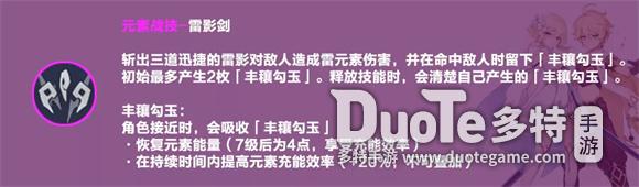 核心机制所在。让雷主自身的充能效率属性转化为全队收益的属性,更放心地去使用旗印四。如果雷主有250%的充能效率,这就意味着「丰穰勾玉」提供给队友的充能效率是20%+250%*10%=45%,通常而言,主C充能从100%到120%不会有质变,但100%到145%效果就很明显了,大部分主C都可以利用这样的充能让自己一套队伍技能释放后也完成充能,间接提供手感和输出。