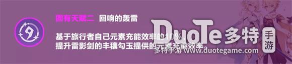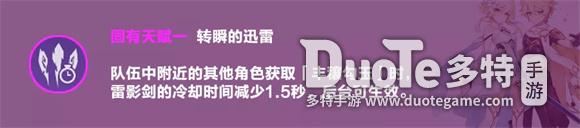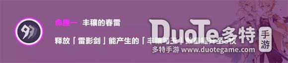 雷影剑的CD本身比较长,这个天赋效果就可以使雷主提供的充能频率提升。注意,一定要队伍中其他角色拾取「丰穰勾玉」才能触发雷主的减CD,你自己的雷主捡「丰穰勾玉」是触发不了这个天赋的。