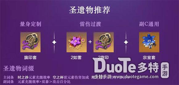 套装中旗印4和宗室4都是比较不错的选择,旗印4主要是有20%的充能效率,为雷主的有效词条,雷主大招伤害虽然高不起来但有四件套加成至少能让雷主不至于是0伤害贡献。
