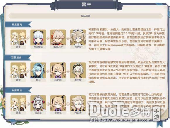 雷主的配队思路也比较明了,给缺充能的C位当拐就行了,上面的配队中,有几点值得注意: