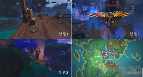 这三把钥匙分别在踏鞴砂的三个木箱里,具体位置如下图: