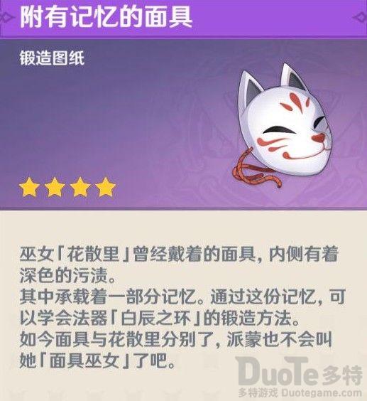 面具用了解锁武器图纸,白辰之环,没什么用,这个东西就是有点纪念意义和价值。很多人最初以为是装饰品,用了戴角色头上的。全部任务完成会有“附有记忆的面具”。是锻造图纸,使用后会被摧毁。白辰之环是加充能的法器,是用是留,请大家酌情选择。