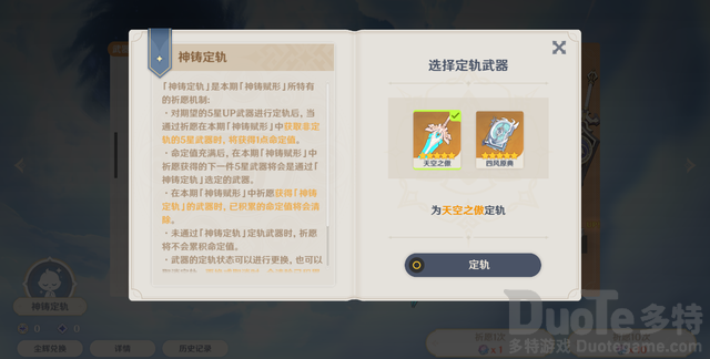 2.0版本武器池加入“定轨”机制,对想要获取的5星武器进行“定轨”,等同于玩家告诉系统“目标武器”。玩家进行抽取过程中获取非定轨武器时,将获得1点命定值,上限为2点命定值。之后的下一次金必定是定轨武器。初看之下,等同是给武器池增加保底机制,不同于角色池的一次保底,武器池是双保底。在本期「神铸赋形」中祈愿获得「神铸定轨」的武器时,已积累的命定值将会清除。