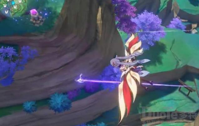 2、借助风场起飞,可以看到紫色的雷元素在进行位移,等它第三段移动到下图位置的时候降落触碰互动,然后快速落回到小岛上。