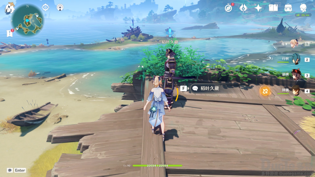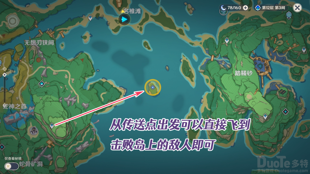 根据任务指引来到南边的海滩,这里可以直接从踏鞴砂的传送点飞过去,具体位置及路线如下图所示: