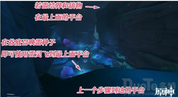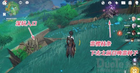 注:深坑内有一个若雷屏障需要解除,需要携带雷种子下来,建议各位旅行者在下去以前直接在深坑旁边的雷樱枝条处召唤雷种子,下来以后直接进入若雷屏障。