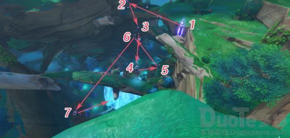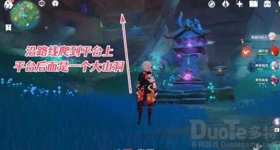 这座镇物同样需要寻找两个缺失部件,开启元素视野后,首先跟随指向西北方向的引导,按下图所示方向爬到平台山洞入口。