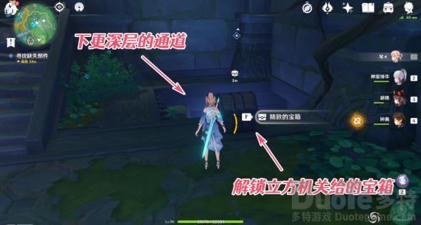 首先跟随镇物附近向东北方向的元素指引,就能看到一个深坑,进入这个坑内。