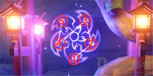 解谜顺序:按照下图所示的图案顺序,依次调整5处机关的序列,简单来说就是逆时针12354。(PS:可以数勾玉的数量,一个勾玉就是第一个开启,两个勾玉就是第二个开启,以此类推。)