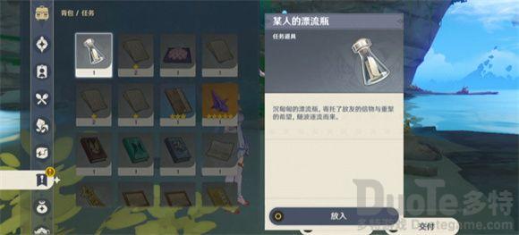 原神广海的守望任务流程1.本任务区别于其他任务,需要在1.2的雪山版本在龙脊雪山的海岸拾取物品——漂流瓶。这里请注意,漂流瓶的拾取过程以及获得后,无任何的任务触发提示。一共三个瓶子可以拾取,但物品即包裹内的漂流瓶,只有一个。