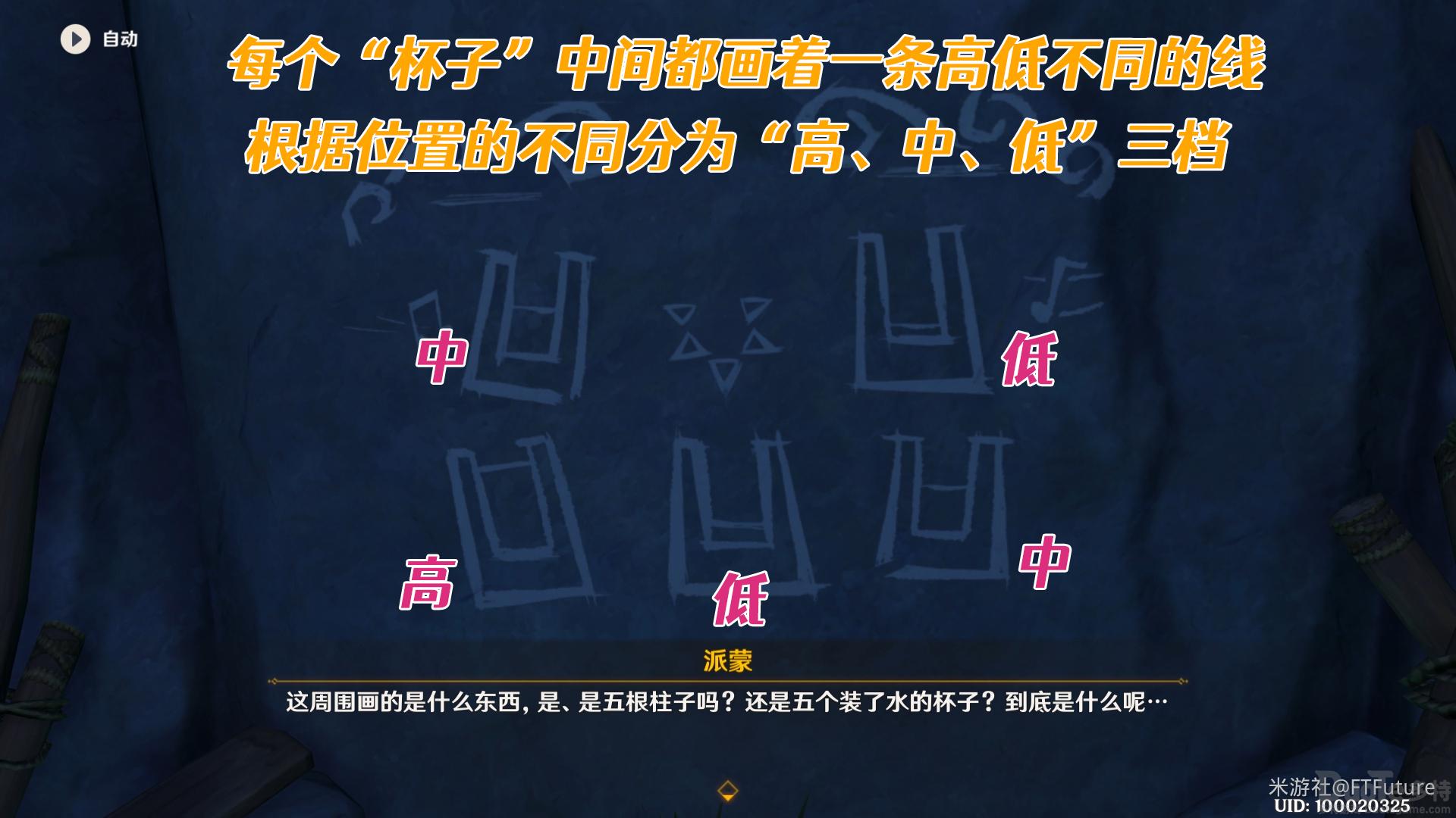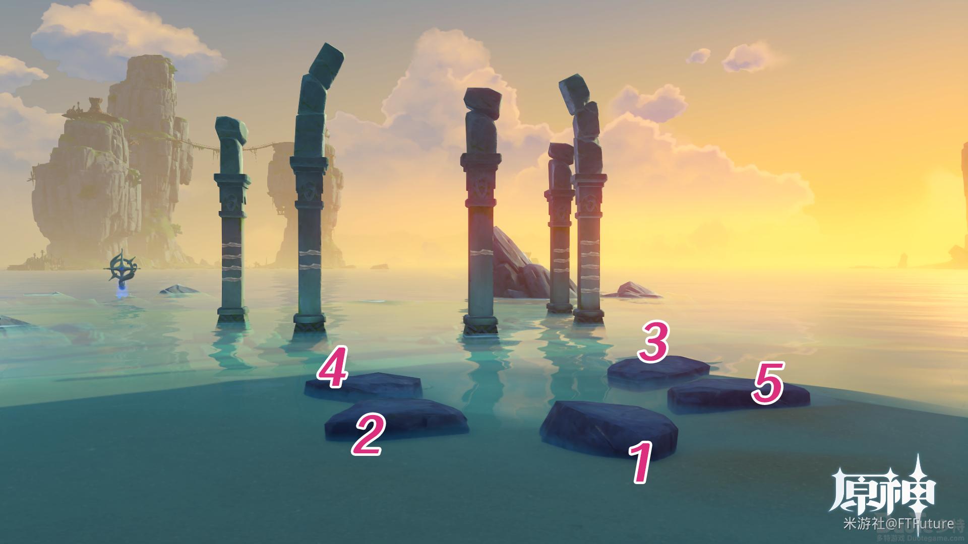 所有水池水位调整完成后回到石柱处,按照石柱上的刻痕数量顺序依次踩下对应石头。