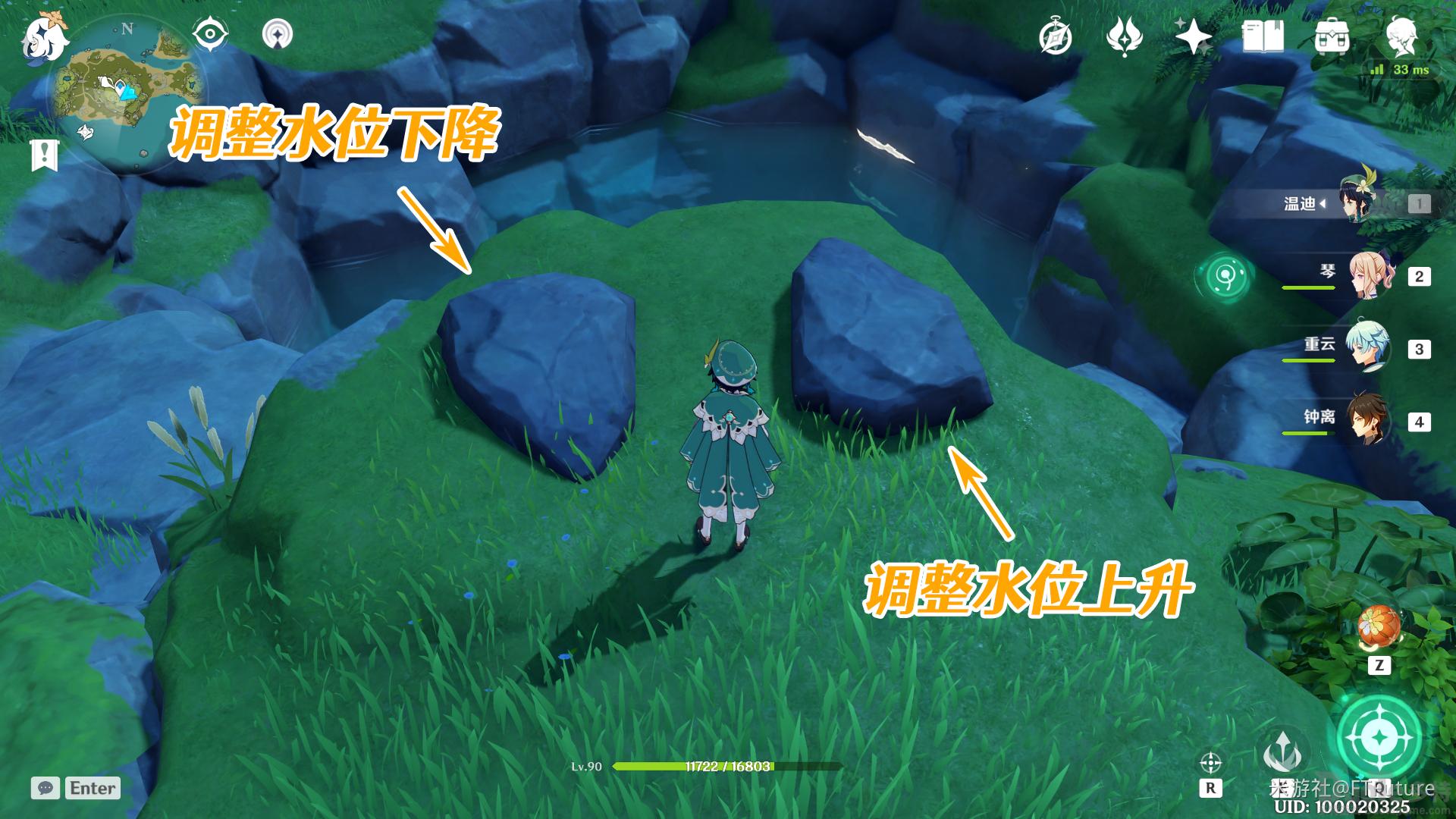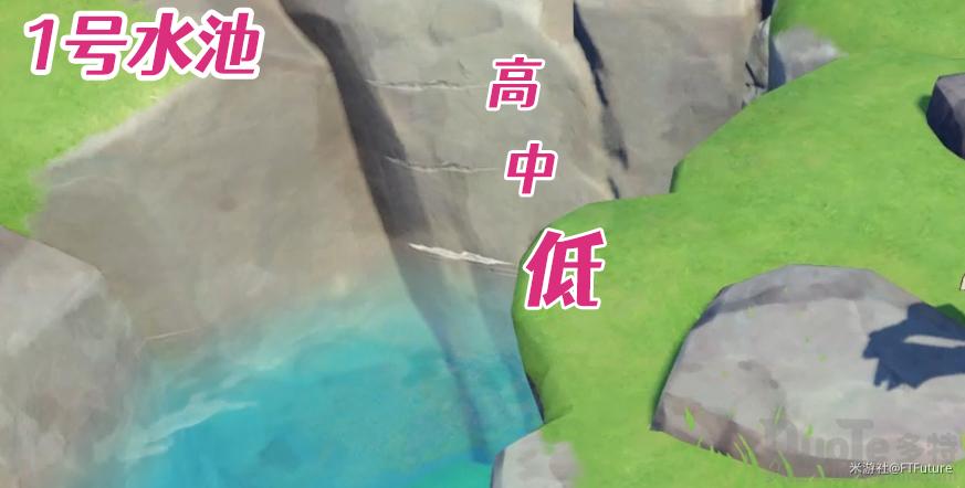 前往对应位置查看。在水池边分别都有两块调节水位上下的石头,站上去后可以调节水池高度。水池上有刻度显示。