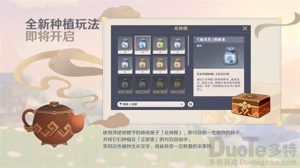 等了2个版本终于可以在家里种菜了,在视频展示中我们看到可以收集区域特产的种子进行种植,这个功能大幅减少了爬悬崖摘琉璃袋的劳动力!