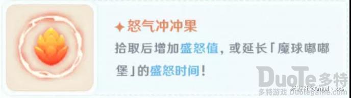 2.怒气冲冲果:拾取后有2种效果,未盛怒时拾取,增加1/3怒气值;盛怒时拾取,延长盛怒时间5s,增益buff,对积分的获取帮助巨大。