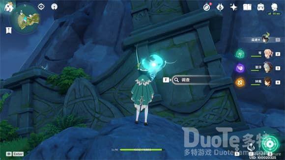 调查点在仙灵旁边这个刻着元素符号的石柱上,靠近即可调查。