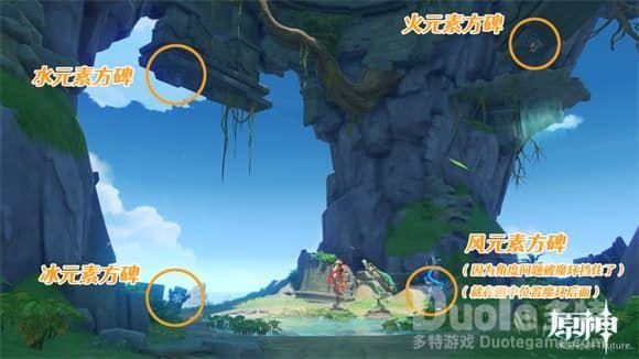 在周围有石柱上显示的四种属性的元素方碑,火元素方碑和水元素方碑在山体顶部倒悬,冰元素方碑和风元素方碑则在山脚下。