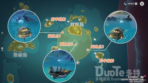 下面直接给出3个调查点在地图上的详细位置,图中黄色调查范围内的3个橘黄色圆圈即为调查点,可以看出基本都处于这两截船所在位置的连线上。靠近水面上的泡泡即可进行调查。