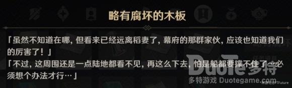 将两块木板上的内容联系起来,我们终于得知:这些人是从稻妻出来的,在路上不幸遭遇了海难,生死未卜。但派蒙不愧是派蒙,这种时候还在惦记着说不定已经沉入海底的货物,催促着旅行者赶快寻找。