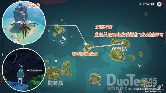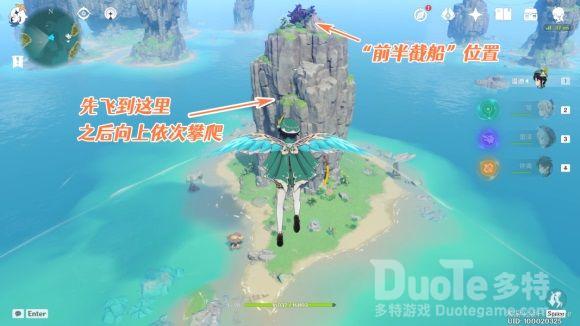 注:从双双岛传送锚点出发飞行,无法直接飞到山顶,需要飞到山腰平台后向上攀爬。当然,比起开船过去从山脚攀爬,飞行路线要快得多。