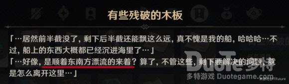 听从派蒙的提议,我们决定去找找另外的半截船。根据木板上所说,我们发现的是“后半截船”,上面说他是顺着东南方向漂流的。