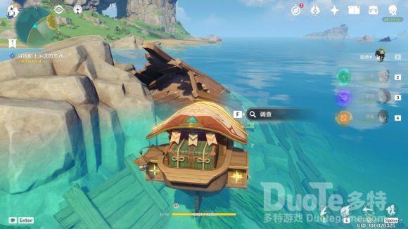 调查木板即可触发世界任务「自外而来」。下图中橘黄色圆点即为任务触发位置,可以从布丁岛的浪船锚点出发直线到达。
