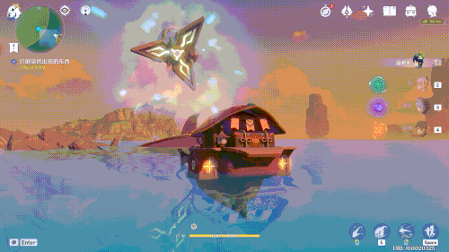 各位旅行者想必对这个东西并不陌生,它就是在龙脊雪山也出现过的「机关守卫」。机关守卫的血量约为1w7左右,会使用冰属性的三连击。我们不用下船,直接使用浪船的平A和E技能即可将其快速击败。