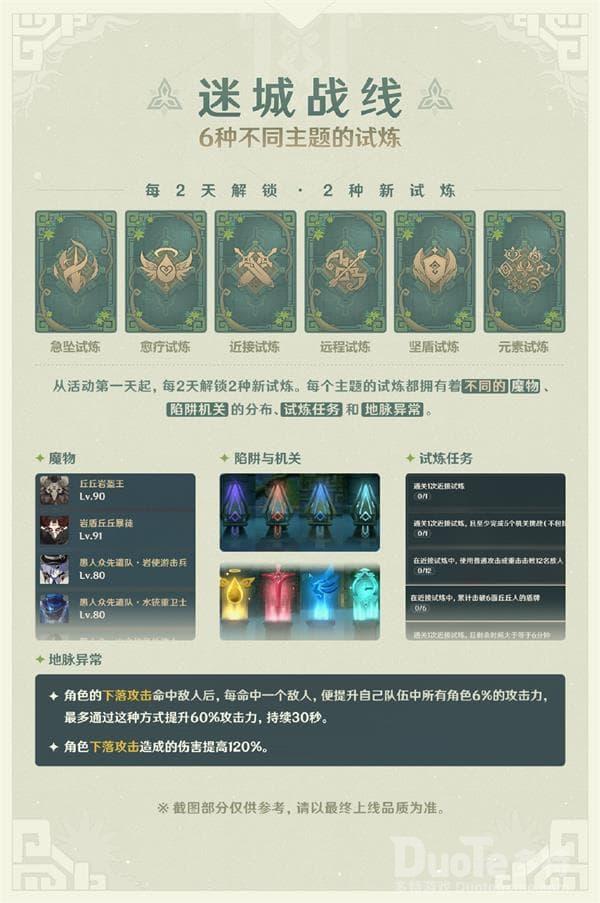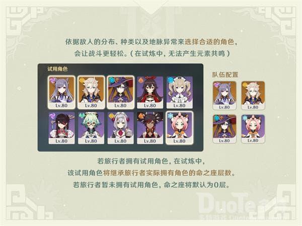 活动期间,旅行者可以使用指定的试用角色编队并挑战6个不同主题的试炼,完成试炼任务可获得原石、大英雄的经验、天赋培养材料等奖励。