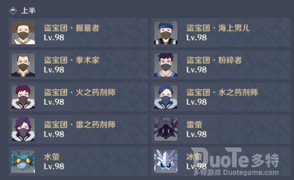 上半的盗宝团物抗均低,近战盗宝团的攻击伤害不容小觑,且动作连续、带强打断效果,各类药剂师投掷元素瓶伤害不高,但是可与其他药剂师和雷、水、冰莹甚至场地雷地脉触发如超载、冰冻、感电反应,请注意躲避。