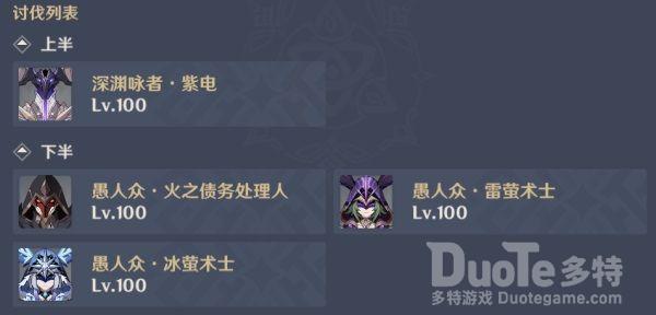 第一波敌人配置为4只雷莹+拳术家+粉碎者+火、水药剂师;第二波敌人配置为2只水莹+2只冰莹+掘墓者+海上男儿+2个雷药剂师。上半的场地中间有雷电地脉石,每隔15s周期性地对周围的敌人及在场角色附加雷属性附着,且敌人在雷属性附着期间抗打断能力极大增强。