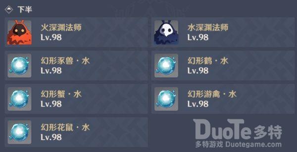 第一波为带水泡buff(每隔一段时间在怪物周围生成四个触碰到会被会禁锢水属性泡泡)的水深渊法师以及松鼠、猪、鸭子水幻形;第二波为带灼烧buff(对周围在场角色持续造成随在场时间增长的火属性伤害)的火深渊法师以及螃蟹、鹤水幻形。