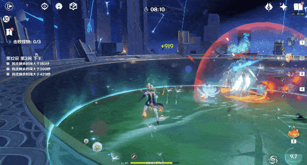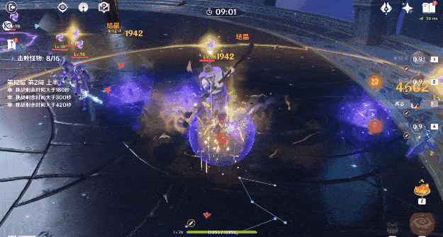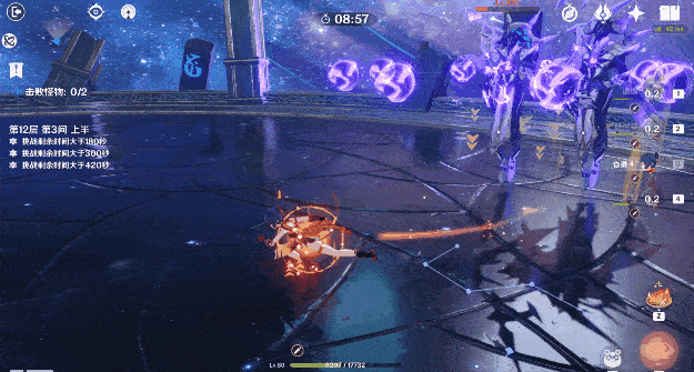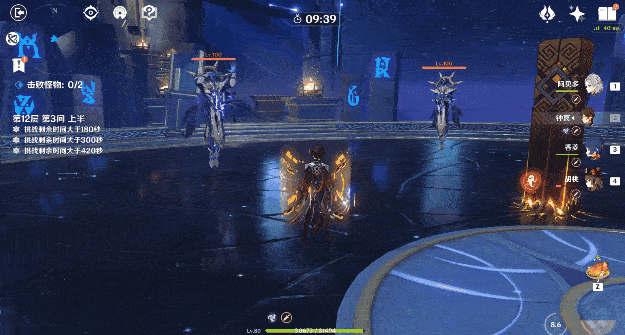 (3)在对一阶段深渊咏者进行输出时,应注意控制两个深渊咏者的位置,最好推至墙边站一起,不仅提高输出效率,且因为深渊咏者开盾进入二阶段时不会移动,能让破盾技能同时打到两个怪物。