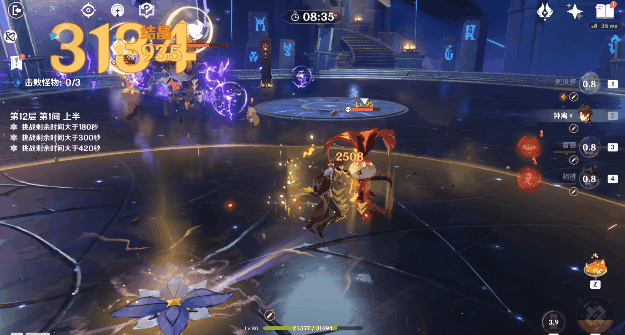 场地中的雷地脉石会周期性给周围的怪物以及在场角色上雷元素附着,提高怪物抗打断能力,在没有护盾的情况下不推荐硬碰硬。本间上半推荐使用物理、冰、水、火等伤害角色配合聚怪、护盾角色进行击破。