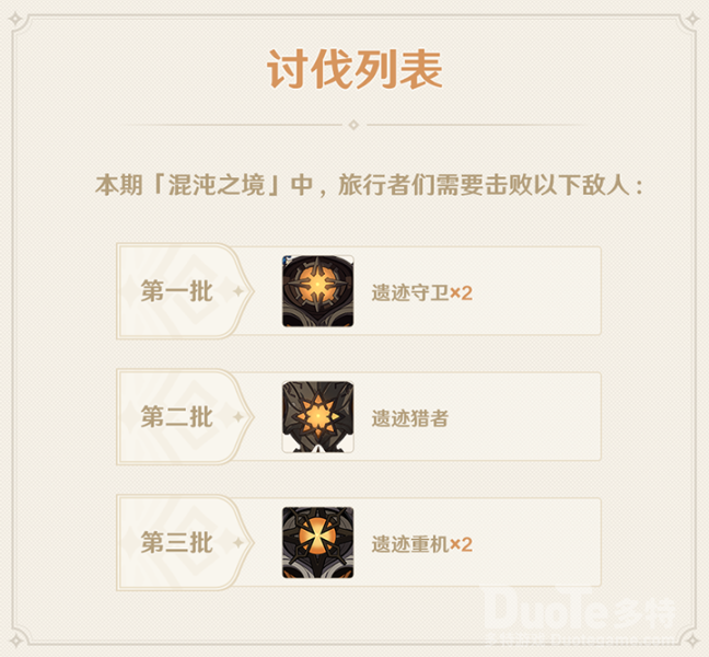 挑战共会出现3波魔物:第一波为2只遗迹守卫;第二波为一只遗迹猎者;第三波为2只遗迹重机。