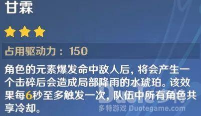 【疾雷之舞】对菲谢尔加成很大,【甘霖】能让菲谢尔一直打出感电,保证【疾雷之舞】的触发。不带芭芭拉的话利用【甘霖】破火枪盾。
