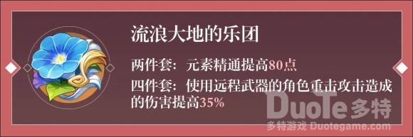 「烟绯」自身约60%的伤害来源于重击,其技能模组也是围绕强化重击设计,因此【乐团】4也是可选的套装选择,但该效果和大招的重击加伤、「烟绯」自身的火伤加成加算。作为依赖增幅反应的火伤主C,元素精通对「烟绯」的提升与【魔女】4反应系数提升基本持平。整体收益上和【魔女】4差距微乎其微,【魔女】4胜在通用性高、相对容易获取,实际选择套装时应根据小伙伴自身仓库选择。
