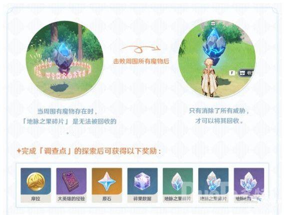 旅行者们的目标是前往各处的「调查点」,回收「地脉之果碎片」。旅行者们一共可以从「调查点」中回收以下三种「地脉之果碎片」: