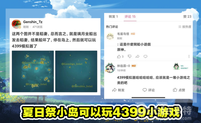 Genshin Intel还放出了两张图片,很明显是新地图,上面散布着一些小岛,有外服玩家猜测这个是否就是稻妻城的一部分,不过国内的内鬼往生堂主进行了回应,这并非稻妻城,而是主角从璃月坐船出发去稻妻城,结果船坏了,停在了这个岛上,岛上面有很多小游戏,类似4399,再结合之前夏日祭的消息来看,夏日祭应该就是在这座小岛上举办,也是稻妻城来临前的一个版本。