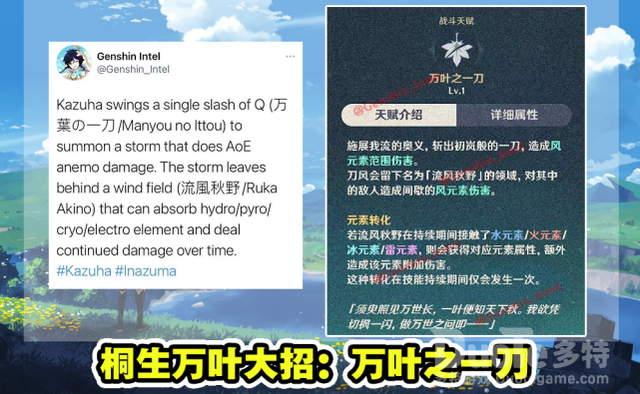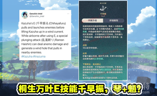 然后是外服内鬼Genshin Intel带来的消息,他直接放出了桐生万叶的技能截图,还是中文版的。首先是E技能千早振,大家可以看上图,先是将敌人与物体牵引致所在位置,击飞范围内的敌人,造成风元素伤害,然后桐生万叶会借由气流腾空而起,进行下落攻击时,会变成下落攻击·乱岗拨止,不仅攻击变成了风元素伤害,而且落地后还会产生风穴,牵引附近的敌人和物体,简直就是琴的E技能+魈的下落攻击。
