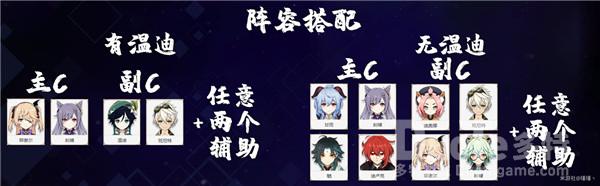 这里没写胡桃/钟离,个人认为这两个角色在这个关卡过于强力,有的话都可以带,配合两个副C/辅助即可配队;与上个阶段不同的是温迪虽然同样op,但在没有攻击buff加持的情况下,带个雷系主C帮忙聚怪打感电效果更为效率;无温迪的情况和上图一样,选择搭配能触发元素反应的主副C组合,在任选两个辅助就能轻松过关!