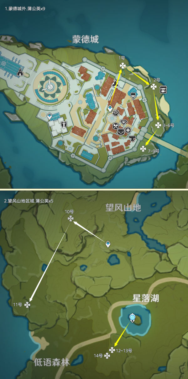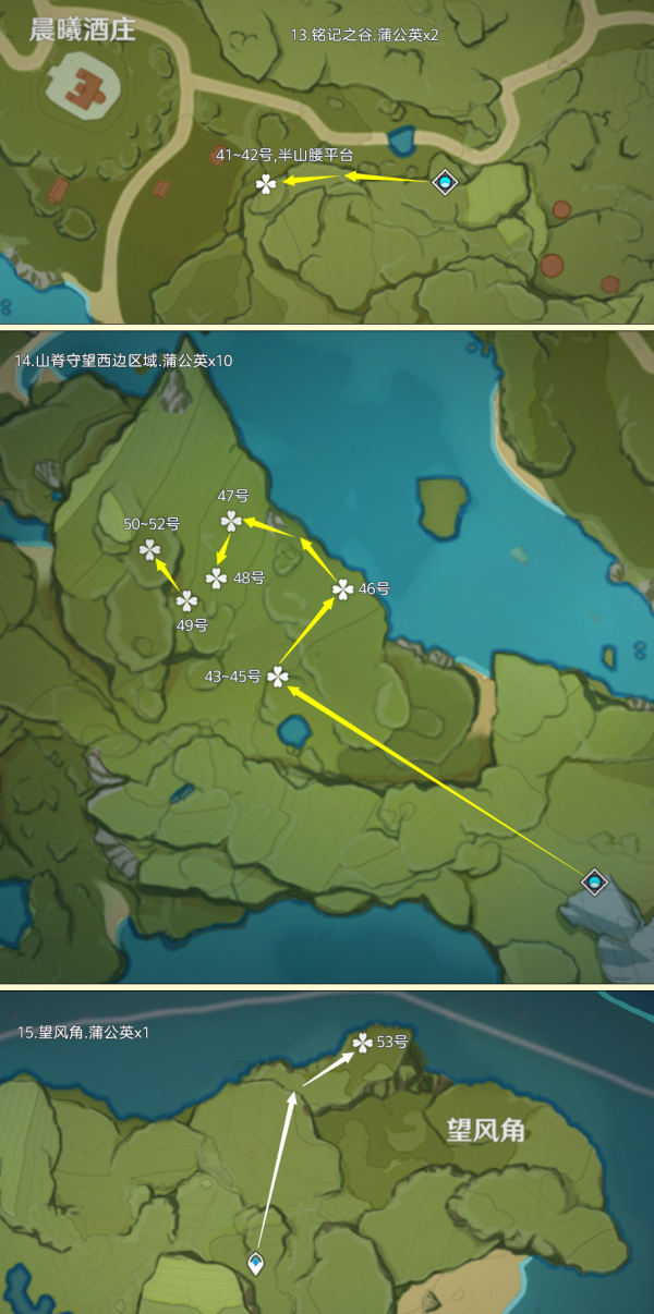 蒲公英点位大多数分布在蒙德区域内,还有3个特殊点位分布在枫丹境内,其中可重复采集数量为56个;制作路线时尽量遵循从上往下游,视野高好看清,方便旅行者探索。