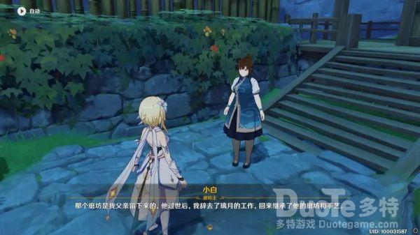 回到磨坊后和小白对话得知:小白的父亲去世后,她也放弃了璃月的工作回来继承这个磨坊,觉得在这里能够回想起曾经和他父亲的经历。